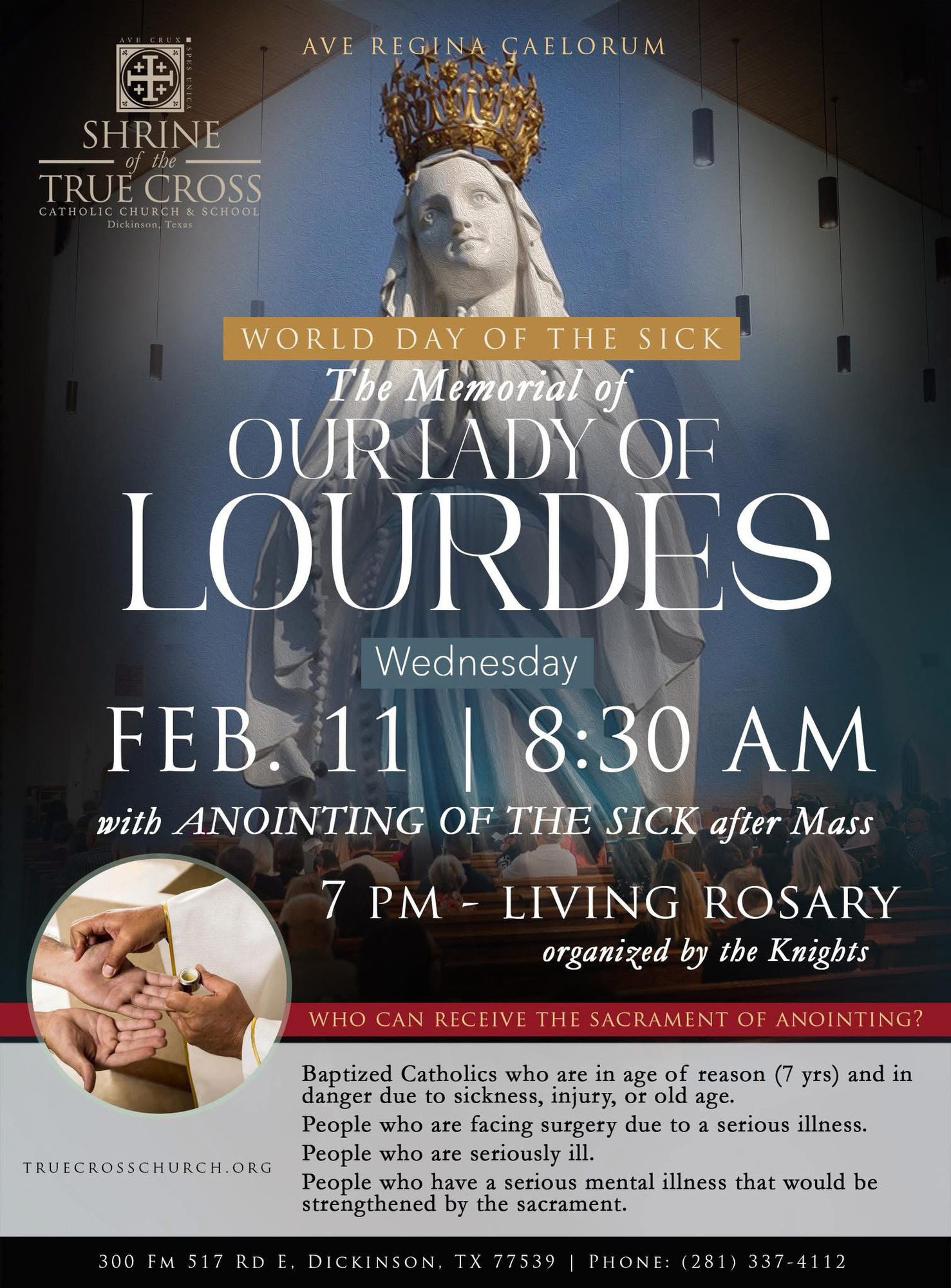 Para una unción que no sea de emergencia, por favor llame a la oficina parroquial al 281-337-4112.